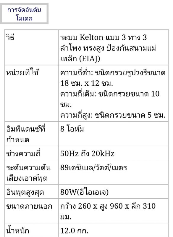 สมบูรณ์ ลำโพงรุ่นนี้ออกแบบมาให้เป็นระบบ 3 ทาง ความต้านทาน 8 โอห์ม เป็นลำโพงแบบตู้เปิด