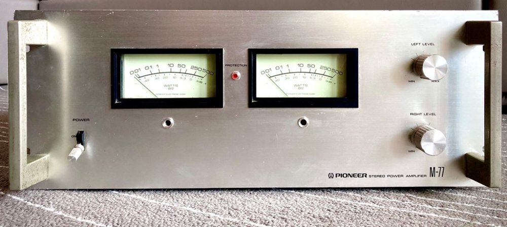 Pioneer รุ่น M-77 เป็น Power Amp รุ่นใหญ่ไฟแรง กำลังขับถึง 250 วัตต์ต่อข้าง มีเข็ม VU ด้านหน้าเครื่อง สวยคลาสสิคเสียงดี